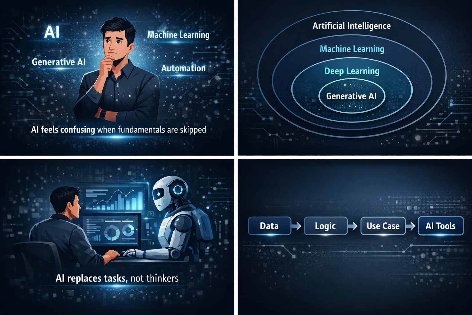 AI feels confusing not because it is impossible to understand, but because most discussions start from tools instead of fundamentals. People jump directly into using chatbots, automation tools, and AI platforms without understanding how decisions are made underneath.