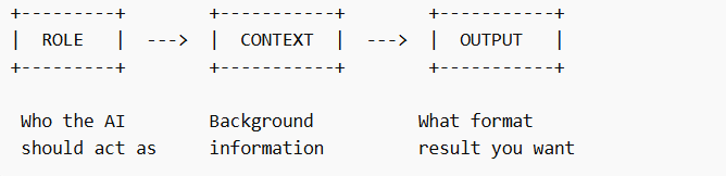 A simple and effective method for writing prompts is the Role – Context – Output framework.